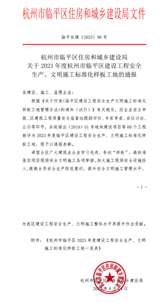 根據《關于印發<臨平區建設工程安全生產文明施工標準化樣板工地管理辦法>的通知(試行)》的規定,經過企業自主申報、區建筑工程質量安全監督站的跟蹤評價、專家審查、會議討論和公示等環節,余政儲出(2019)51號地塊建設項目等共計60個工程被評為2023年度臨平區建設工程安全生產、文明施工標準化樣板工地。浙江眾安建設集團的鑫業路學校項目作為其中之一受到通報表彰。